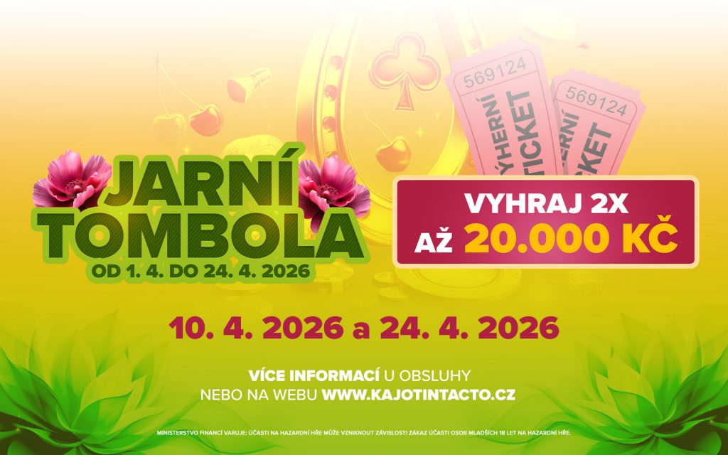 Zapojte se od 1. 4. do 24. 4. 2026 do jarní tomboly, která proběhne v casinu Kajot Intacto ve Zlíně. Stačí během soutěže sbírat tombola lístky za své bety a zvýšit tak svou šanci na výhru.